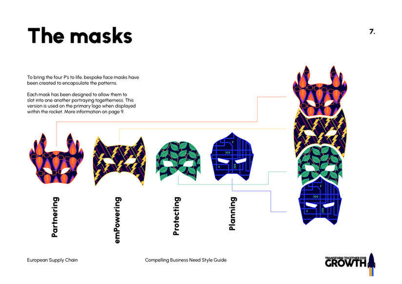 To bring the four P’s to life, bespoke face masks have been created to encapsulate the patterns. Each mask has been designed to allow them to slot into one another portraying togetherness, they come together like this in the logo.